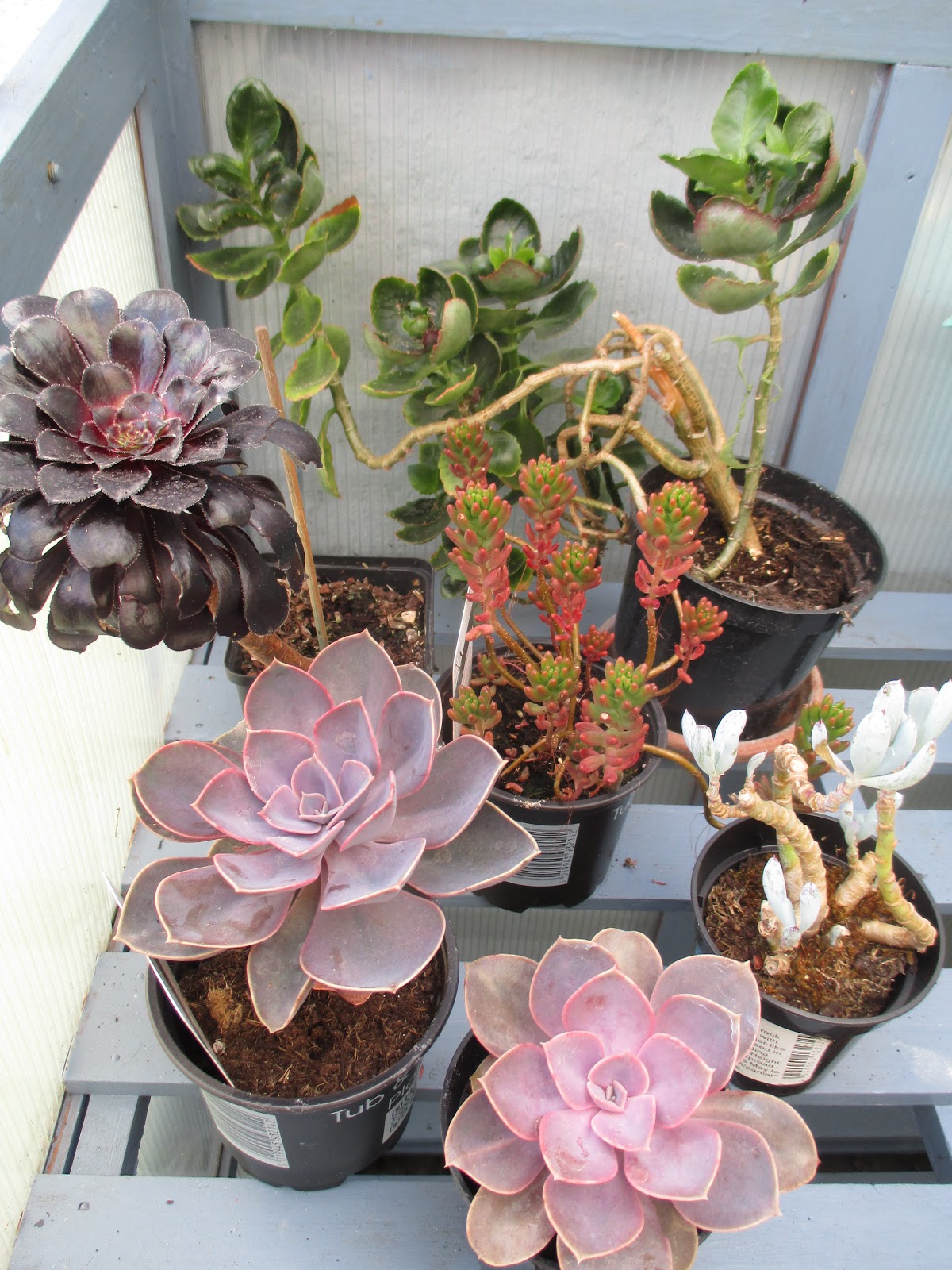 The mini greenhouse is where I grow seedlings in spring and over-winter plants, and in it is my little succulent collection which made it through the cold temperatures of last winter.