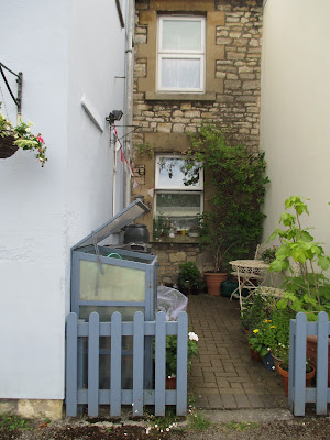 Outside the back door, our little side-return area is a place to sit and eat, pot up plants or read a book. We have lots of pots here, as there is no soil, and there are herbs, honeysuckle and container plants, as well as a fig tree and a mini greenhouse. P says there are far too many pots, but I like to have greenery nearby, since we can't see our back garden from the house.