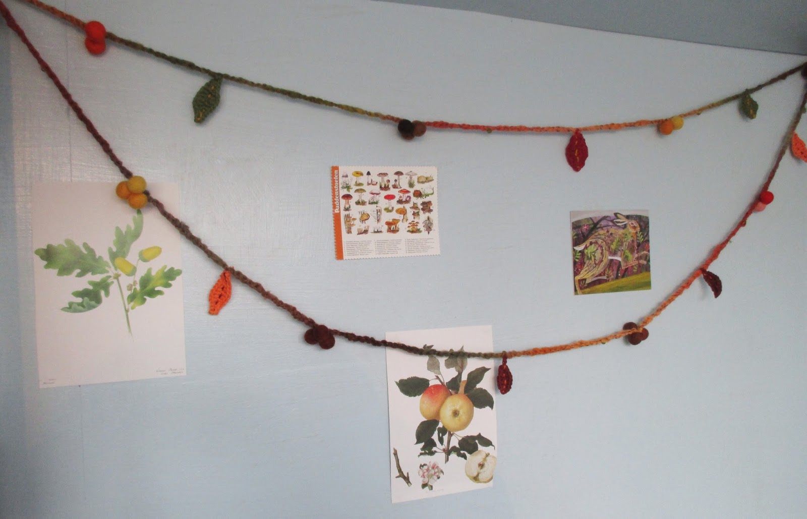Then I crocheted some little leaves from cotton yarn in complimentary shades and attached them with the little felt 'berries' along the length of the crocheted chain to make an autumn garland.