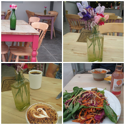 We emerged from the jungle feeling hungry and made for the lovely cafe which sells delicious food made from the gardens' produce. I was very taken with the wooden furniture painted in shades of pink, lilac and yellow, and the sweet peas on every table.